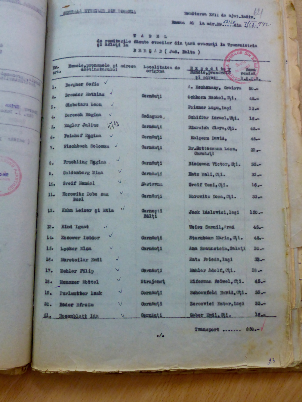 Let's have a closer look to the above document from the September 1942 in order to comprehend its significance. It displays 21 recipients of payments, being deported to Bershad in Transnistria, as well as the payments effected in R.K.K.S (Reichskreditkassenschein) by donors from Romania destined for softening the cruel fate of their relatives and/or friends. Out of 21 entries, 13 deportees came from Czernowitz, 3 from other places in Bukovina, 1 from Bessarabia and for 4 of them no place of origin was mentioned. That is very much in line with the content of this database, meaning that the overwhelming majority of the deportees, who received a financial aid came from Bukovina. After processing the Ghetto Prisoners Database, made available to the public both by courtesy of MIGDAL and the State Archives of Odesa Oblast, we've compiled a listing of more than 5,000 payment transactions to deportees in Transnistria, sorted by the recipients.